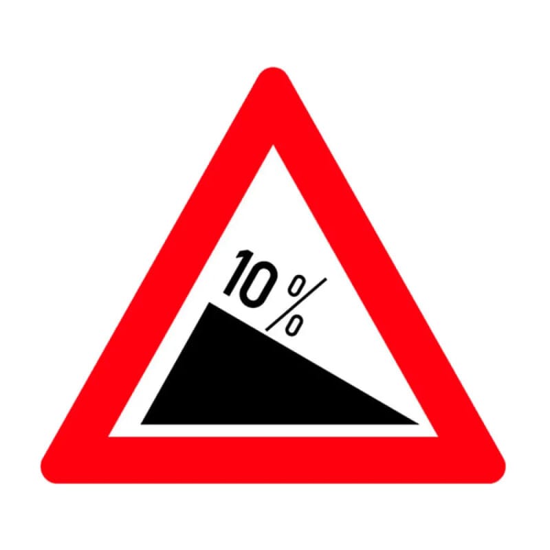Tehlikeli Eğim İniş Trafik Levhası, sürücülere ileride dik bir iniş eğiminin bulunduğunu bildirerek güvenli sürüş için hayati bir uyarı sağlar.