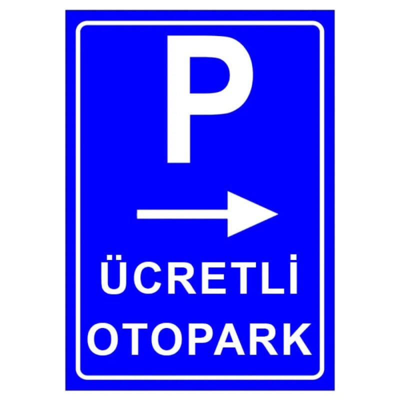Ücretli Otopark Yön Tarifi Levhası – Sağdan, araç sürücülerini ücretli otopark alanlarına yönlendirmek ve trafik düzenini sağlamak amacıyla tasarlanmış etkili bir trafik tabelasıdır. Bu tabela, otopark alanını kolayca bulmayı sağlar ve sürücülerin belirtilen güzergaha doğru hareket etmelerine yardımcı olur.